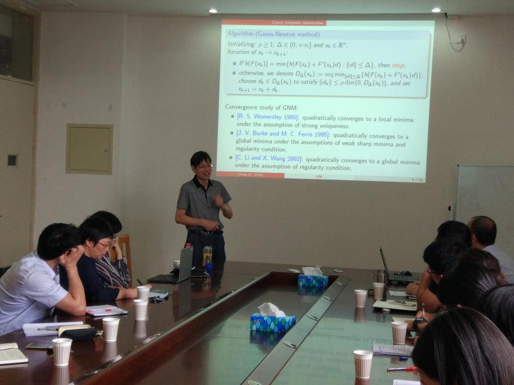 李冲教授的研究课题主要涉及非线性逼近理论、非线性优化理论、科学计算等领域。李冲教授在报告中首先给出了复合凸优化问题的定义及其应用领域,接着从高斯-牛顿法求解的困难点引出线性临近点算法(LPA),并给出了LPA局部超线性收敛的条件。进一步对全局LPA及非精确LPA做了分析。最后,通过对传感器网络定位问题求解,将LPA与SDR (SemiDefiniteRelaxation)方法做了比较与分析。李冲教授的报告内容丰富,逻辑清晰,语言生动,给广大师生带来了优化领域的前沿和热点问题,使大家深受启发。报告后李冲教授和我院师生就算法中的参数选择等问题进行了深入交流。