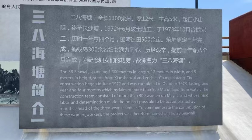 接着调研团沿着道路来到了著名的三八海塘。站在三八海塘线上,远处的潮汐似乎将思绪拉回到了上世纪70年代,无法想象蚂蚁岛上300余名妇女仅仅用16个月的时间凭借双手和破旧的工具不分昼夜劳作筑起了这条1300多米的"三八"海塘的艰苦岁月。“男人出海、女人持家”,在当时那个物质贫乏的时代,全岛300多名年轻妇女,用无比坚韧的意志创造了一个“传奇”——仅用16个月,人拉肩扛,在滩涂里筑就了一座海塘“超级工程”。岁月如梭,涛声依旧,“三八海塘”依旧静静地矗立在海边,它如同一面镜子,映照着艰苦创业的过去。